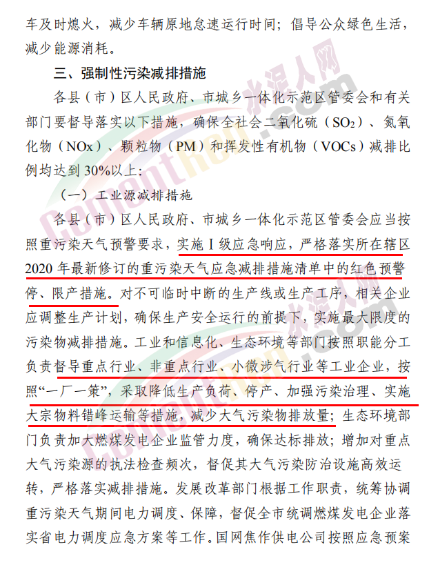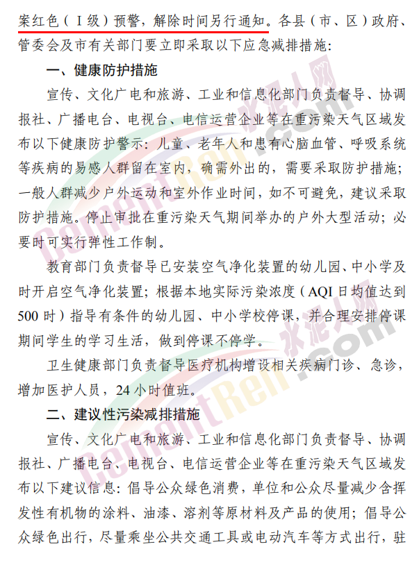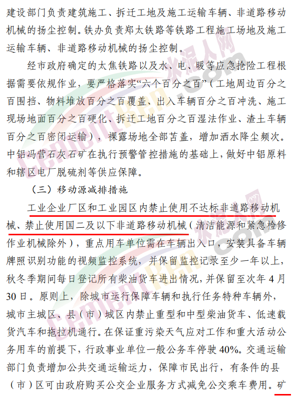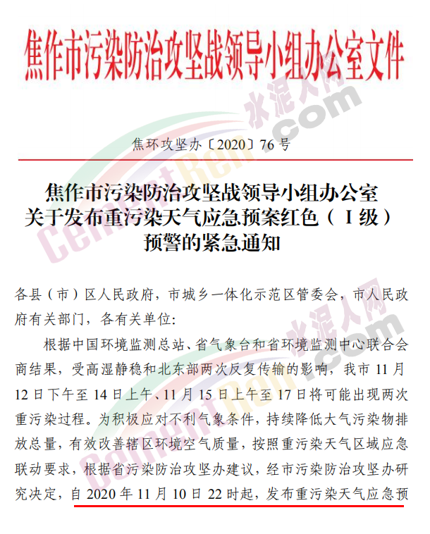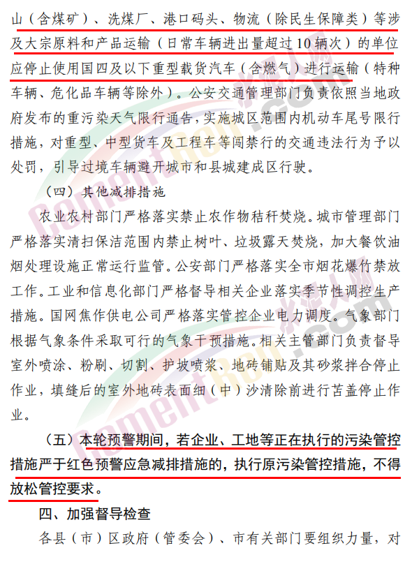 焦作市污染防治攻堅戰(zhàn)領導小組辦公室發(fā)布《關于發(fā)布重污染天氣應急預案紅色(Ⅰ級)預警的緊急通知》稱,根據省污染防治攻堅辦建議,經焦作市污染防治攻堅辦研究決定,自 2020 年 11 月 10 日 22 時起,發(fā)布重污染天氣應急預案紅色(Ⅰ級)預警,解除時間另行通知。各縣(市、區(qū))政府、 管委會及市有關部門要立即采取應急減排措施。工業(yè)源減排措施方面要求各縣(市)區(qū)人民政府、市城鄉(xiāng)一體化示范區(qū)管委會應當按 照重污染天氣預警要求,實施Ⅰ級應急響應,嚴格落實所在轄區(qū)2020 年最新修訂的重污染天氣應急減排措施清單中的紅色預警停、限產措施。不可臨時中斷的生產線或生產工序,相關企業(yè)應調整生產計劃,確保生產安全運行的前提下,實施最大限度的污染物減排措施。預警期間,嚴禁工業(yè)企業(yè)新開生產線或運行新的生產設備, 對于重污染天氣績效評級 A 級、績效引領、民生保障等企業(yè), 原則上鼓勵企業(yè)自主減排和僅準許特定保障任務的生產經營。長期停產及未建成企業(yè)復產或試生產前,須向縣(區(qū))、市兩級污染防治攻堅辦報告,經同意后方可進行。揚塵源減排措施方面要求礦山、砂石料廠、石材廠、石板廠等應停止露天作業(yè);施工工地停止室外作業(yè)。建筑垃圾清運車輛和砂石運輸車輛禁止上路行駛。開挖土石方的挖掘機等非道路移動機械停止作業(yè)。施工工地內停止使用國二及以下非道路移動機械。移動源減排措施要求工業(yè)企業(yè)廠區(qū)和工業(yè)園區(qū)內禁止使用不達標非道路移動機械、禁止使用國二及以下非道路移動機械,重點用車單位需在車輛出入口,安裝具備車輛牌照識別功能的視頻監(jiān)控系統(tǒng),并保留監(jiān)控記錄至少一年以上, 秋冬季期間每日登記所有柴油貨車進出情況,并保留至次年4月30日。礦山(含煤礦)、洗煤廠、港口碼頭、物流等涉及大宗原料和產品運輸的單位應停止使用國四及以下重型載貨汽車(含燃氣)進行運輸。本輪預警期間,若企業(yè)、工地等正在執(zhí)行的污染管控措施嚴于紅色預警應急減排措施的,執(zhí)行原污染管控措施,不得放松管控要求。