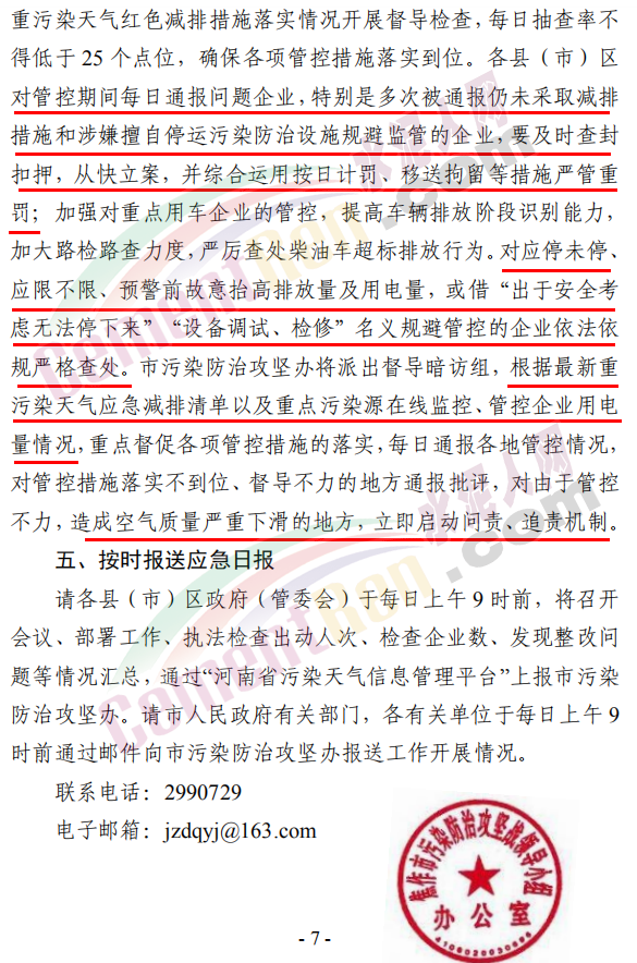 加強對重點用車企業(yè)的管控,提高車輛排放階段識別能力, 加大路檢路查力度,嚴厲查處柴油車超標排放行為。對應停未停、 應限不限、預警前故意抬高排放量及用電量,或借“出于安全考慮無法停下來”“設備調試、檢修”名義規(guī)避管控的企業(yè)依法依規(guī)嚴格查處。市污染防治攻堅辦將派出督導暗訪組,根據最新重污染天氣應急減排清單以及重點污染源在線監(jiān)控、管控企業(yè)用電量情況,重點督促各項管控措施的落實,每日通報各地管控情況,對管控措施落實不到位、督導不力的地方通報批評,對由于管控不力,造成空氣質量嚴重下滑的地方,立即啟動問責、追責機制。