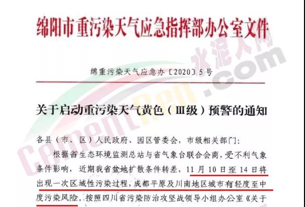 四川綿陽發布《關于啟動重污染天氣黃色(Ⅲ級)預警的通知》要求十個區縣啟動重污染天氣黃色(Ⅲ級)預警。綿陽市重污染天氣應急指揮部將對各地各相關部門重污染天氣應急預案措施落實情況開展明查暗訪。對預案啟動不及時、應對工作不力、措施落實不到位的地區和單位進行通報,并納入生態環境黨政同責考核內容。