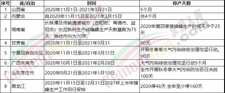 近期,山西、內蒙、新疆、黑龍江等15個地區發布2020~2021年秋冬季水泥企業錯峰生產計劃,最長停產達160天以上。