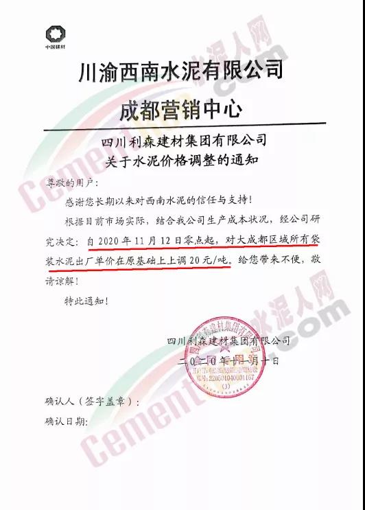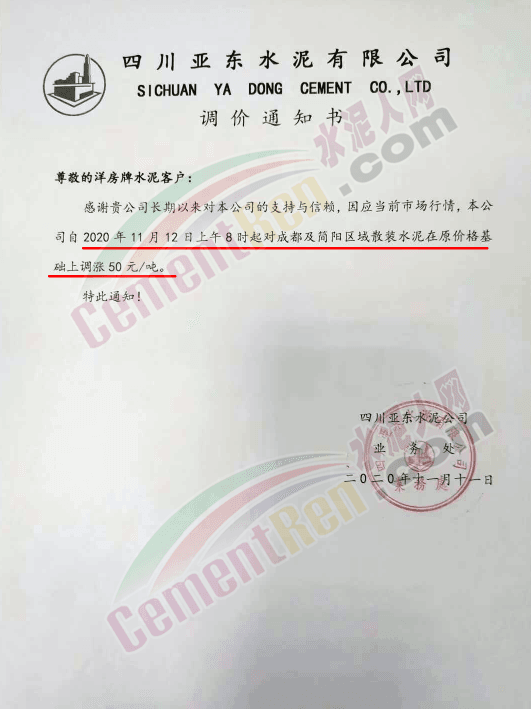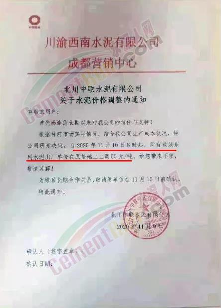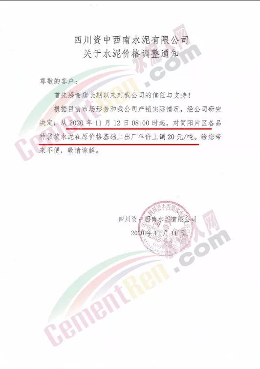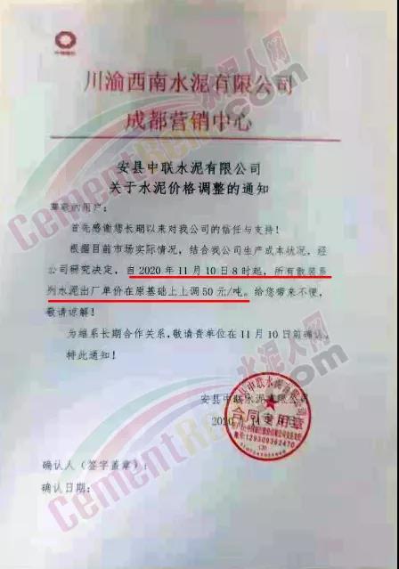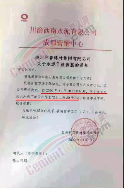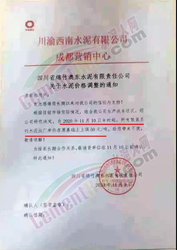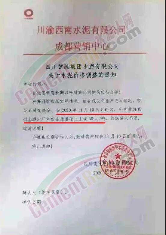 渝西南水泥成都營銷中心德勝集團、綿竹澳東水泥、利森建材集團、北川中聯水泥、安縣中聯水泥通知11月10日早8時起起5家工廠散裝水泥出廠價格同步上調50元/噸 。