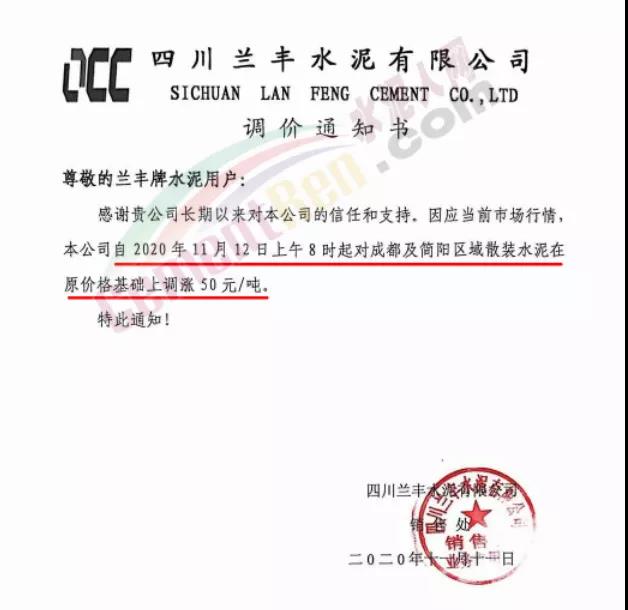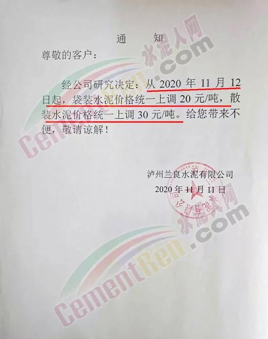 瀘州蘭良水泥有限公司通知自11月12日起,袋裝水泥統一上調20元/噸,散裝水泥價格統一上調30元/噸。