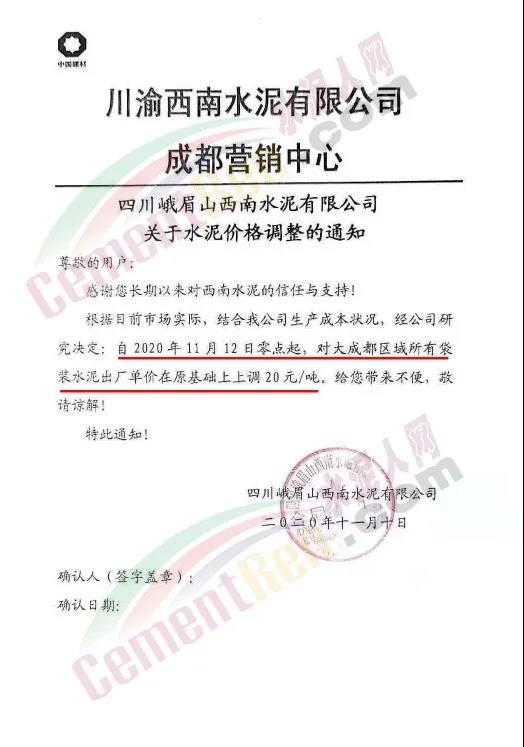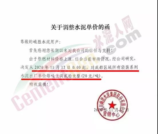 四川峨勝水泥通知自11月12日零時起,對成都區域所有袋裝水泥上調20元/噸。