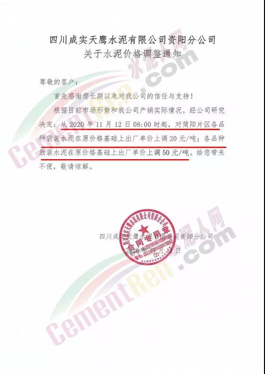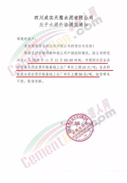 四川成實天鷹水泥、四川成實天鷹水泥資陽分公司等通知自12日起上午8時起,對簡陽片區各品種袋裝水泥出廠價上調20元/噸。各品種散裝水泥上調50元/噸。