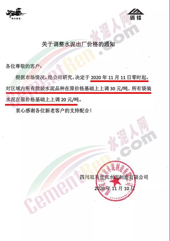 四川雙馬宜賓水泥通知11月11日零時起對區域內所有散裝水泥上調30元/噸,所有袋裝水泥上調20元/噸。