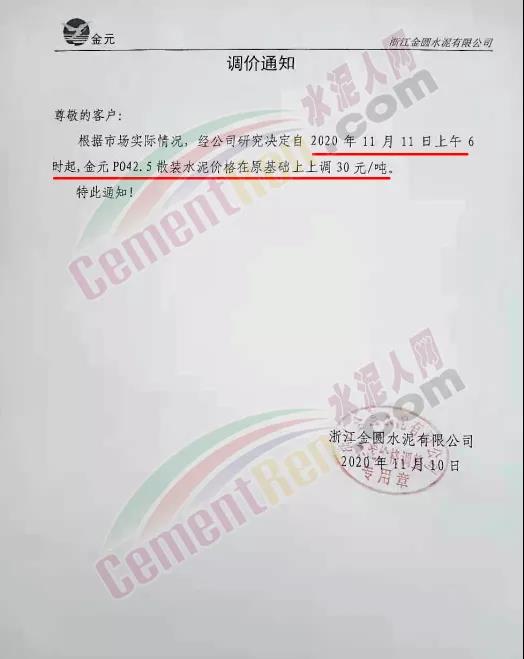 浙江金圓水泥通知11月11日上午6時起,PO42.5散裝水泥 上調30元/噸。