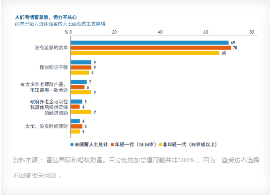 從圖表分析結果來看,2018年尚有44%的受訪者表示有信心(包含“非常自信”和“較為自信”)在工作生涯結束時攢夠足夠儲蓄,2018年這一比例已經降至32%。甚至在已經開始儲蓄的受訪者中,對達成退休儲蓄目標充滿信心的受訪者比例也從2018年的55%降至今年的40% ,只有少數受訪者 (6%) 依舊表示高度自信 。上述一系列的調查結果可能表明,在經濟增長放緩和全球貿易緊張局勢的環境中,不安感正在日益加劇 。所以受訪者降低了退休儲蓄預期,連同實現退休儲蓄目標的信心也略有下降 。但禍福相依,人們可能也因此意識到需要尋求建議或接受金融教育,來彌補財務規劃能力方面的不足。現在作為社會勞動者主力的年輕人,已經想著退休了。年輕人為啥不愿意上班呢?因為上班太累了。