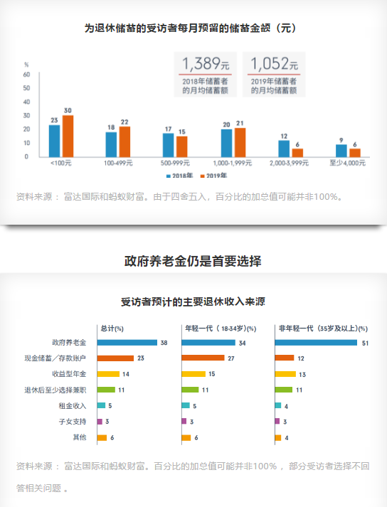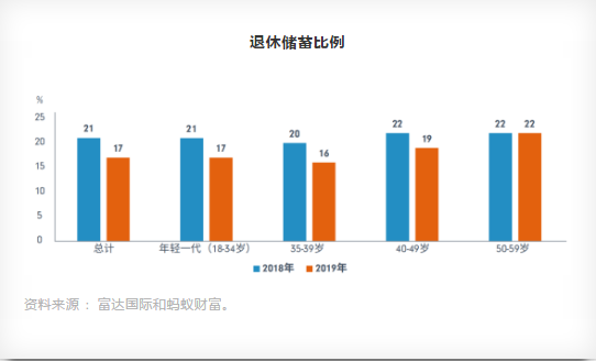 根據調查報告顯示,盡管越來越多的人開始為退休儲蓄,但他們的儲蓄額在下降 。2018年人們每月儲蓄月收入的21%(1,389元)作為退休準備,但2019年這一比例降卻至17%(1,052元)。