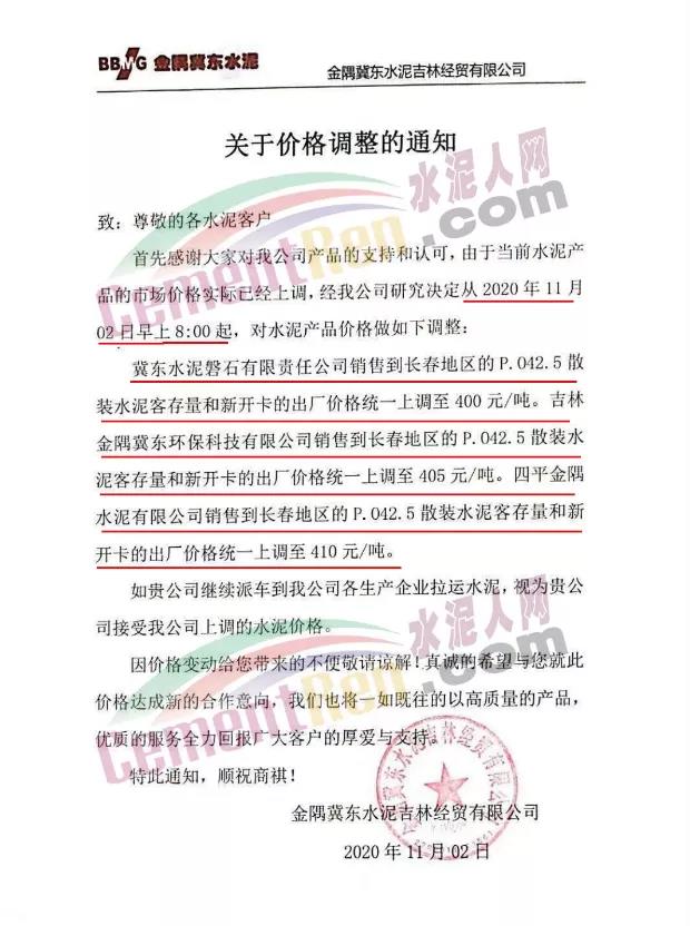 據水泥人網此前報道,近期多區域通知上調水泥價格,東北吉林某企業通知水泥價格一次性上調160元/噸,黑龍江主要品牌企業北方水泥、亞泰水泥一次性上調130~150元/噸。