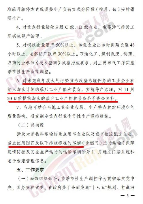 4.對未完成年度大氣污染防治攻堅治理任務的工業企業和納入淘汰計劃的落后工業產能和裝備,實施停產治理。對 11 月20 日前提前淘汰的落后工業產能和裝備給予資金獎補。