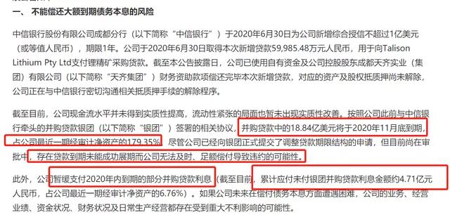 根據公告,天齊鋰業的18.84億美元(約合人民幣124.4億元)并購貸款將于2020年11月底到期,存在無法及時、足額償付導致違約的可能性。