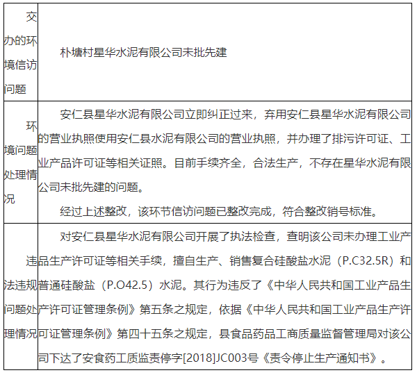 目前手續(xù)齊全,合法生產(chǎn),不存在星華水泥有限公司未批先建的問題。經(jīng)過上述整改,該環(huán)節(jié)信訪問題已整改完成,符合整改銷號標準。