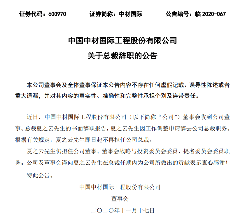 中國中材國際工程股份有限公司董事會收到公司董事、總裁夏之云先生的書面辭職報告,夏之云先生因工作調(diào)整申請辭去公司總裁職務(wù)。根據(jù)有關(guān)規(guī)定,夏之云先生即日起不再擔(dān)任公司總裁。