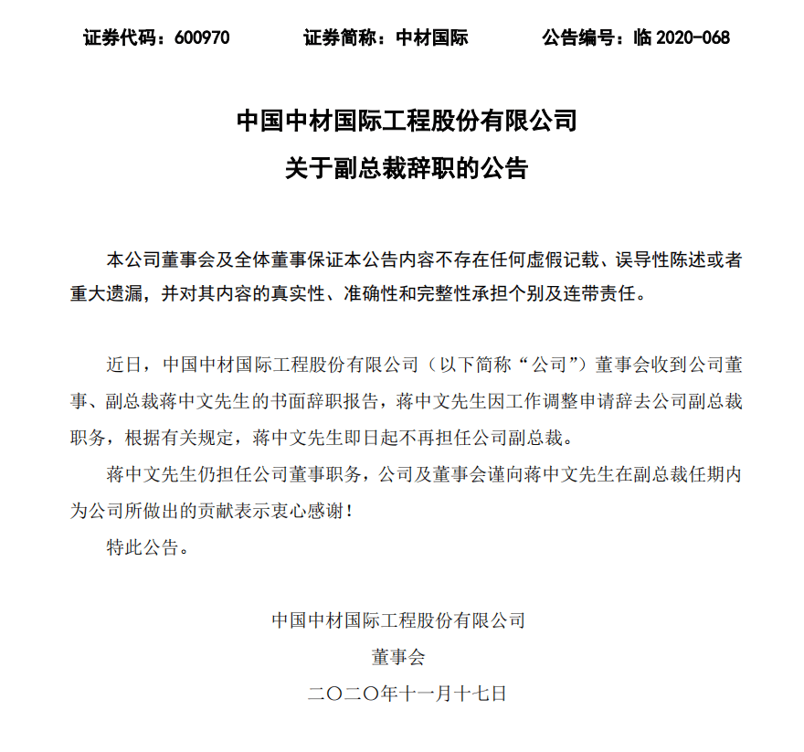 近日,中國中材國際工程股份有限公司董事會收到公司董事、副總裁蔣中文先生的書面辭職報告,蔣中文先生因工作調(diào)整申請辭去公司副總裁職務(wù),根據(jù)有關(guān)規(guī)定,蔣中文先生即日起不再擔(dān)任公司副總裁。