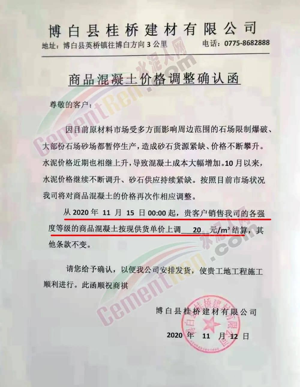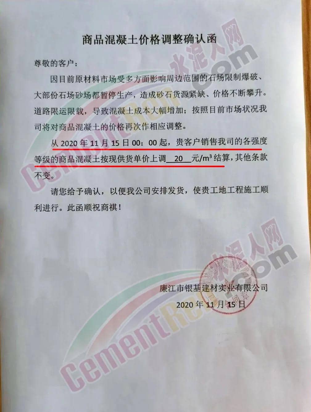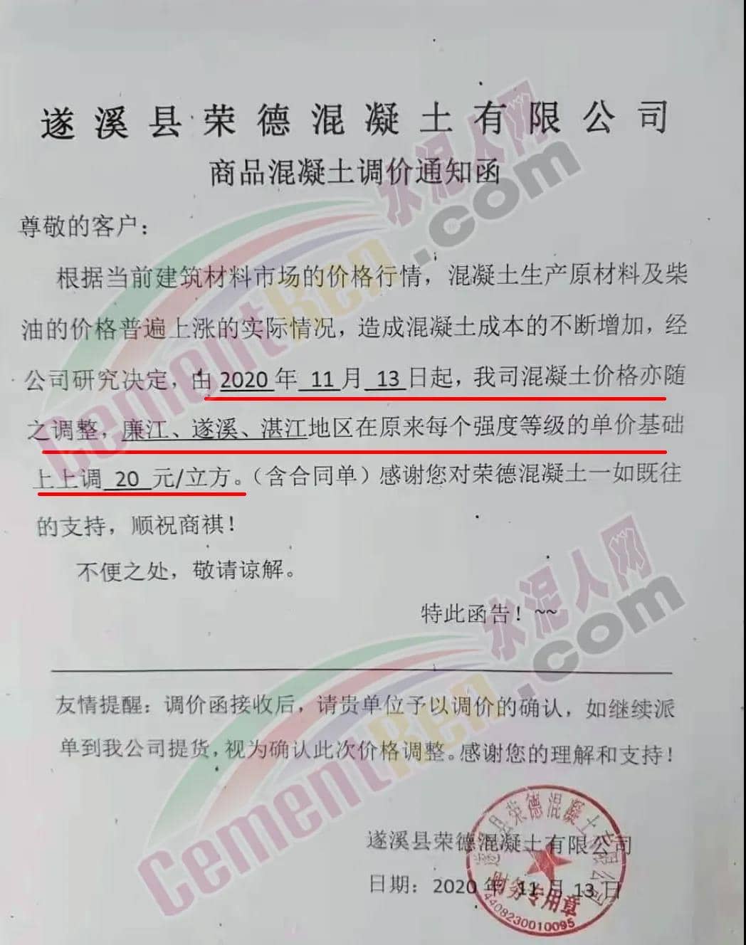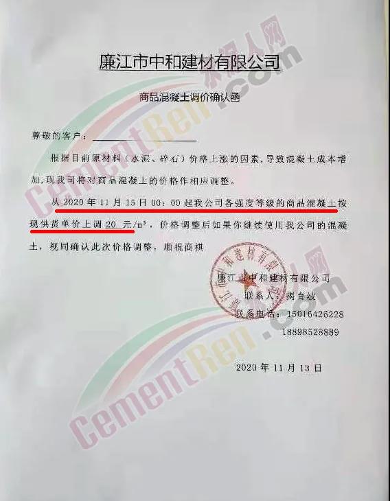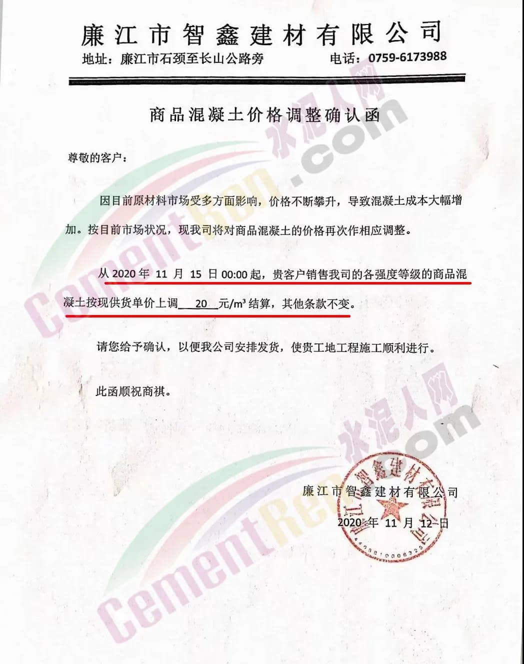 廉江市中和建材有限公司通知,根據目前原材料(水泥、碎石)價格上漲的因素,導致混凝土成本增加,公司對商品混凝土的價格作相應調整。從2020年11 月15日0時起我公司各強度等級的商品混凝土按現供貨單價上調 20 元/立方 。
