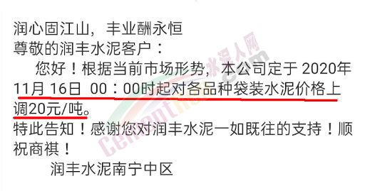 潤豐水泥南寧中區通知根據當前市場形勢,公司定于 2020年11月16日 00∶00時起對各品種袋裝水泥價格上調20元/噸。