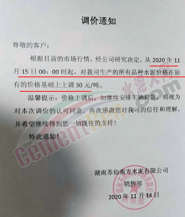 湖南蘇仙南方水泥通知,11月15日0時起上調30元/噸。