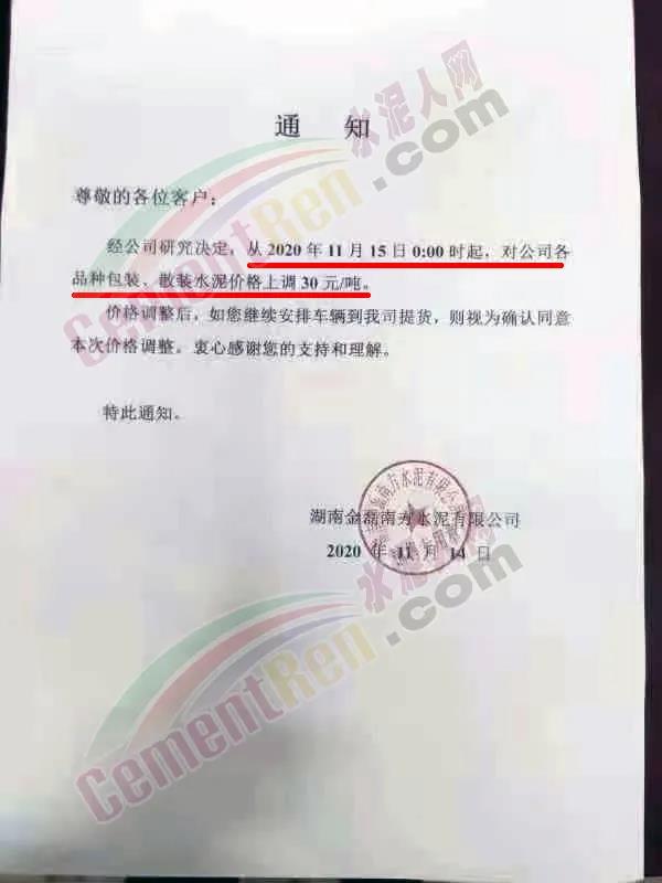 湖南金磊南方水泥通知11月15日0時起,上調各品種包裝和散裝水泥價格30元/噸。