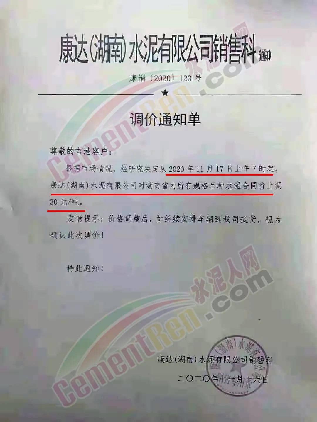 紅獅水泥旗下康達(湖南)水泥有限公司通知11月17日上午7時起對湖南省內所有規格品種水泥合格價上調30元/噸。