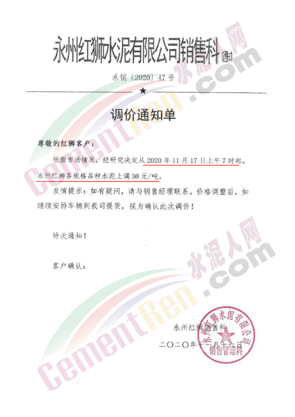 湖南永州紅獅水泥銷售科通知,自11月17日上午7時起,永州紅獅各規格品種水泥上調30元/噸。