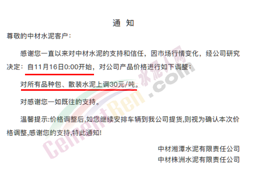 中材湘潭水泥有限責任公司(中材株洲水泥有限責任公司)通知自11月16日0:00開始,對公司所有品種包、散裝水泥上調30元/噸。