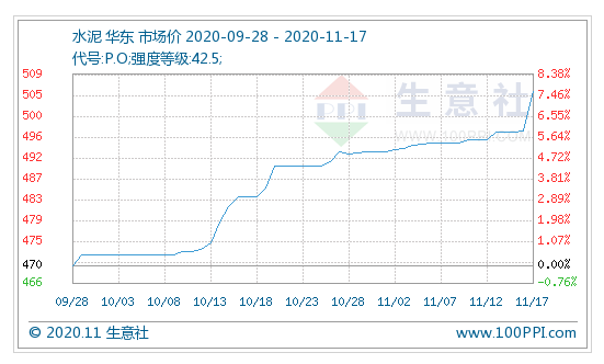 分地區來說,江蘇地區,天氣晴好,市場需求不斷向好,11月3日,江蘇蘇州、常州、無錫等地區主要企業通知高標水泥價格上漲,漲幅在30元/噸。低標暫時穩定。11月13-16日,江蘇浙江、南京等地區主要企業通知各品種水泥價格上漲,漲幅在20元/噸。