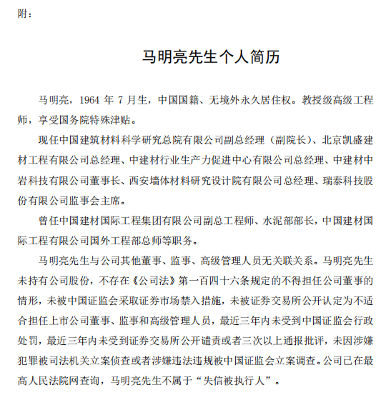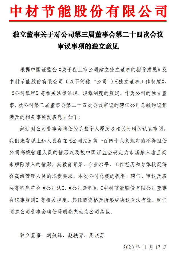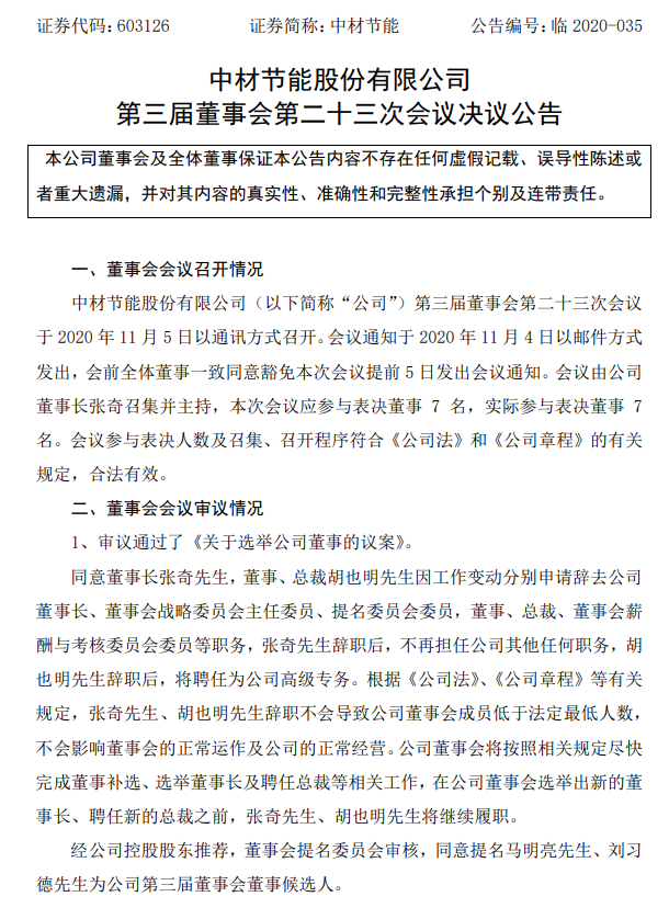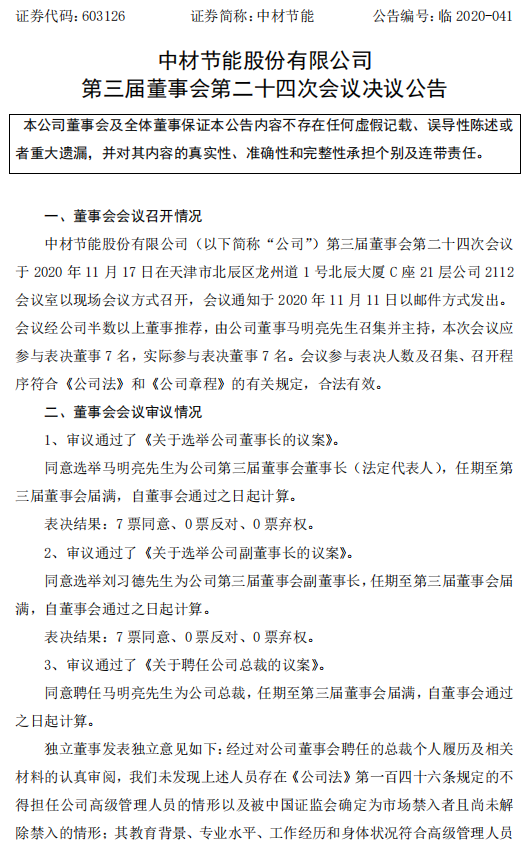 1、胡也明離職總裁職位,離職時間為2020年11月17日,離職原因為:工作變動。2、付貴平上任副總經理職位,上任時間為2020年11月17日。3、馬明亮上任總裁職位,上任時間為2020年11月17日。中材節能股份有限公司是中材集團旗下從事余熱、余壓利用的余熱發電全方位服務商。中材節能致力于工業余熱、余壓的技術開發、綜合利用和產業化,擁有該領域及相關領域的設計、對外貿易經營以及對外工程總承包等各類經營資質,主要從事余熱發電項目的投資、技術開發、系統集成、工程設計、咨詢及工程總承包,提供清潔發展機制項目的開發方案及技術咨詢.中材節能也是經國家商務部批準的承包境外低溫余熱發電系統工程和境內國際招標工程等業務的公司。