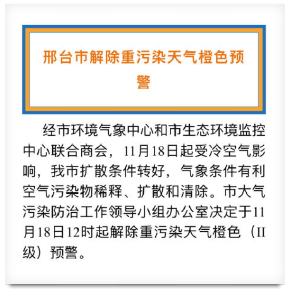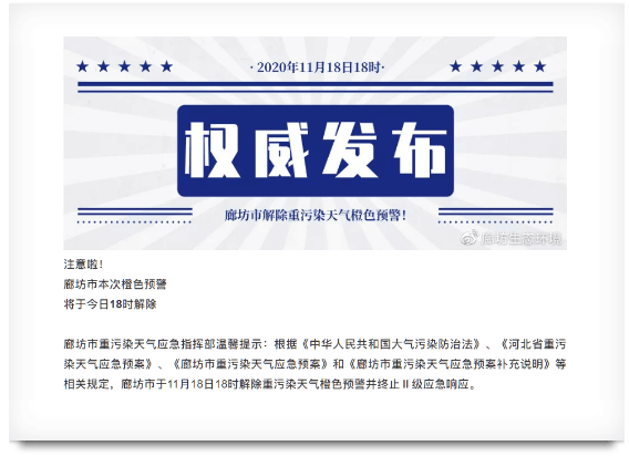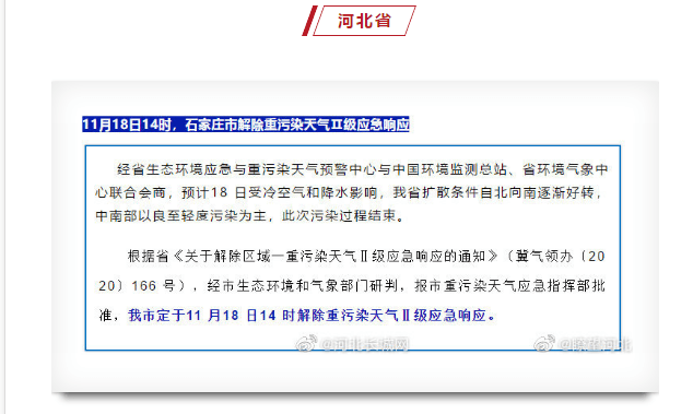 河北保定市11月18日16時解除重污染天氣II級(橙色)應(yīng)急響應(yīng)措施。 根據(jù)省大氣辦《關(guān)于解除區(qū)域一重污染天氣II級應(yīng)急響應(yīng)的通知》冀氣領(lǐng)辦2020166號),預(yù)計2020年11月18日起,受冷空氣和降水影響,保定市空氣質(zhì)量逐步改善,污染過程基本結(jié)束。經(jīng)市政府批準(zhǔn),保定市于11月18日16時解除重污染天氣II級(橙色)應(yīng)急響應(yīng)措施。