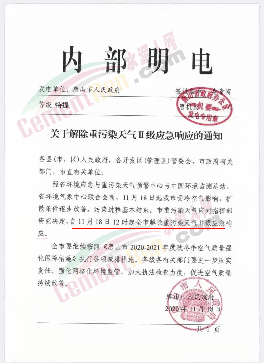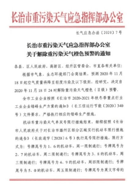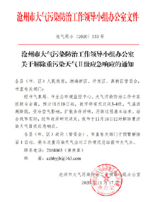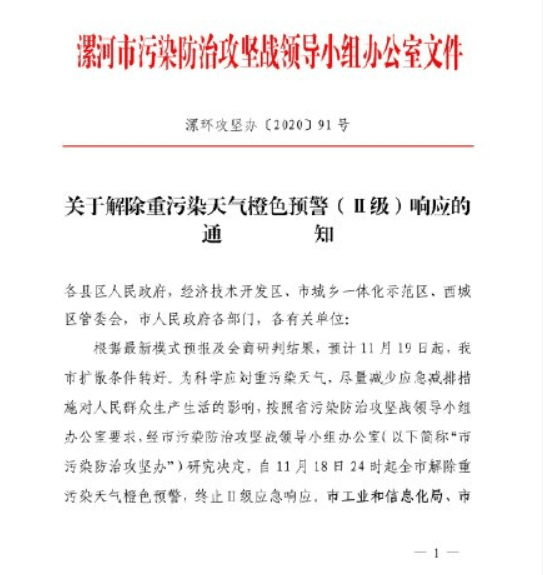關(guān)于解除重污染天氣Ⅱ級響應(yīng)的通知