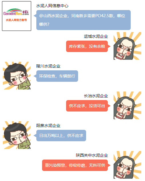 河南新鄉某企業求助水泥人網信息中心,希望能夠對接山西水泥企業。山西運城某企業負責對水泥人網表示,”庫存告急,沒有余糧”。陵川水泥企業回復環保檢查車輛禁行。山西陽泉區域回復日出萬噸以上,供不應求,沒有庫存,產多少銷多少,還有排隊車等候。陜西關中水泥企業回復,重污染天氣,停窯停磨,無料可供... ...
