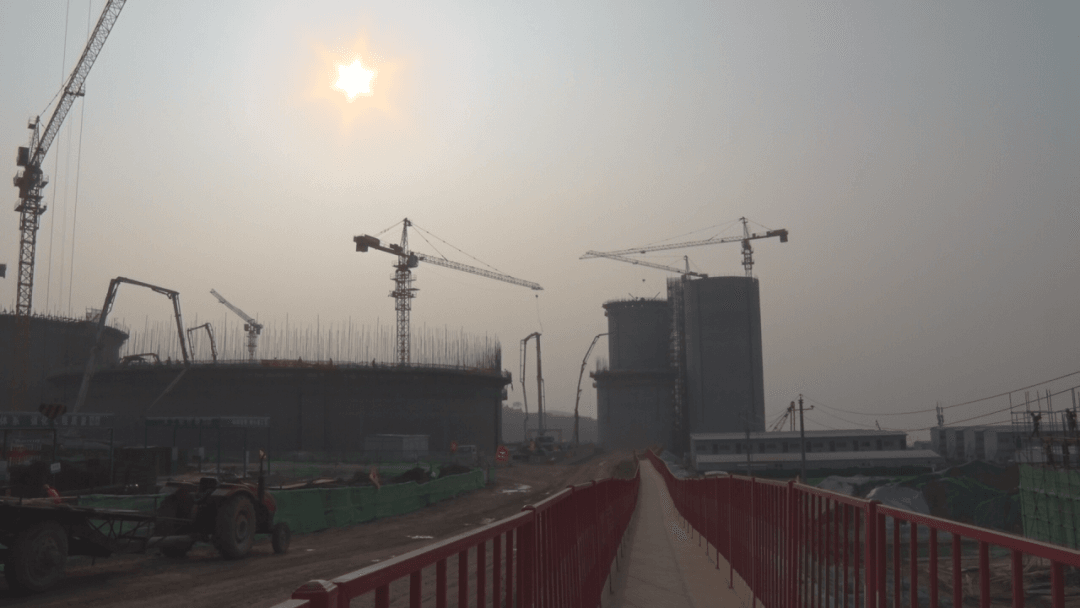 記者:“這里是冀東水泥日產萬噸水泥熟料生產線建設現場,我身后是該項目的核心部分,窯尾預熱器,目前已經建設過半,整個項目正在緊張有序的建設當中,預計明年六月份建成投產,該項目的建成將有效推動省內水泥工業實現更高水平的轉型升級。”