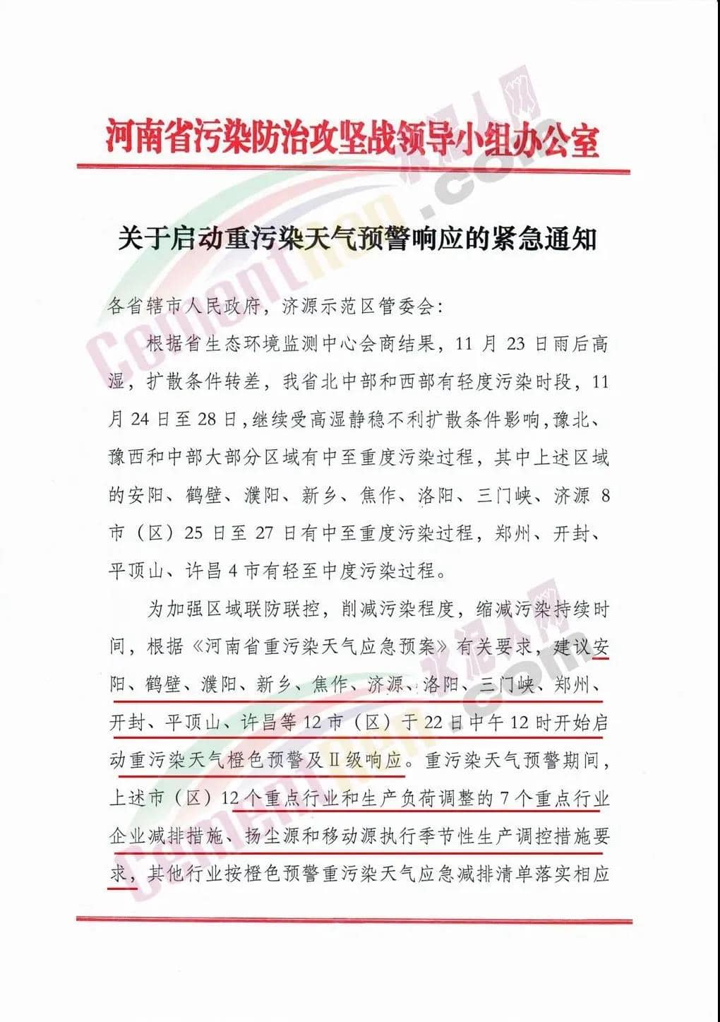 日前,河南省污染防治攻堅戰領導小組辦公室發布《關于啟動重污染天氣預警響應的緊急通知》稱,為加強區域聯防聯控,削減污染程度,縮減污染持續時間,根據《河南省重污染天氣應急預案》有關要求,建議安陽、鶴壁、濮陽、新鄉、焦作、濟源、;洛陽、三門峽、鄭州、開封、平頂山、許昌等12市(區)于22日中午12時開始啟動重污染天氣橙色預警及Ⅱ級響應。重污染天氣預警期間,上述市(區)12個重點行業和生產負荷調整的7個重點行業企業減排措施、揚塵源和移動源執行季節性生產調控措施要求,其他行業按橙色預警重污染天氣應急減排清單落實相應級別的應急減排措施。