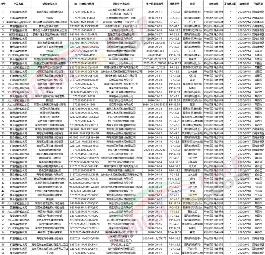 對于不合格產品,青島市市場監(jiān)管部門已依法進行后處理工作。監(jiān)督抽查合格產品列表(水泥)