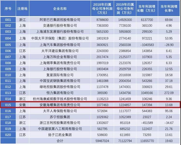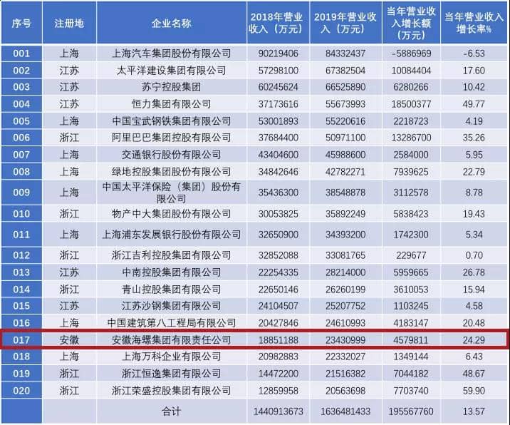 該榜單以2019年企業營業收入為入圍標準,由長三角三省一市企業聯合會共同發布。海螺集團位列長三角企業百強榜第17位,盈利榜第15位,研發費用的投入榜第19位。