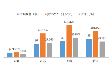 按上榜百強企業數量計,浙江省最多,達到35家,比上年減少1家;上海市次之,達到30家,比上年增加3家;江蘇省為26家,與上年相同;安徽省9家,比上年減少2家。從營業收入合計數看,上海最高,達60340億元,浙江、江蘇、安徽分別為48645億元、45078.4億元和9582.8億元。上海上榜企業的平均營業收入規模超過2011億元,明顯高于蘇浙皖上榜企業。
