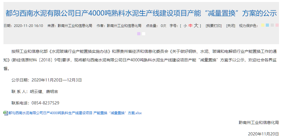 日前,貴州省黔南布依族苗族自治州工業和信息化局官網發布《都勻西南水泥有限公司日產4000噸熟料水泥生產線建設項目產能“減量置換”方案的公示》 。公示顯示,都勻西南水泥有限公司將通過退出貴州中誠水泥有限公司和貴州三都西南水泥有限公司兩條2500t/d熟料生產線,新建一條4000t/d新型干法熟料生產線。
