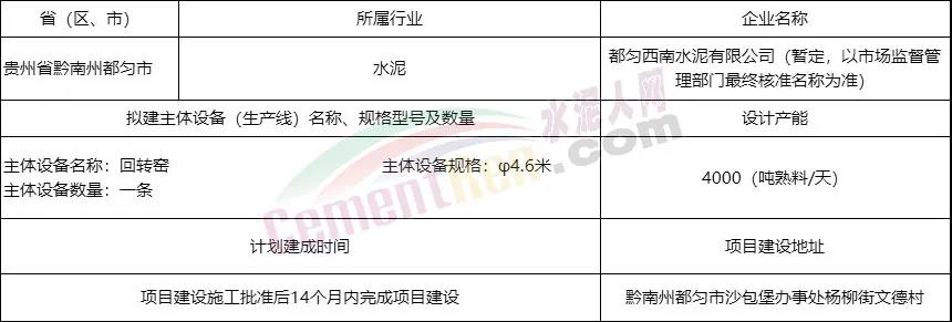 新建項目主體設備回轉窯直徑φ4.6米,設計產能4000t/d,建設地址位于黔南州都勻市沙包堡辦事處楊柳街文德村,將于項目建設施工批準后14個月內完成項目建設。詳情如下:
