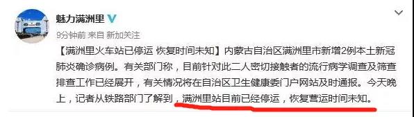 內蒙古滿洲里市所有人員核酸檢測,火車停運、學校停課、公共場所暫停營業!