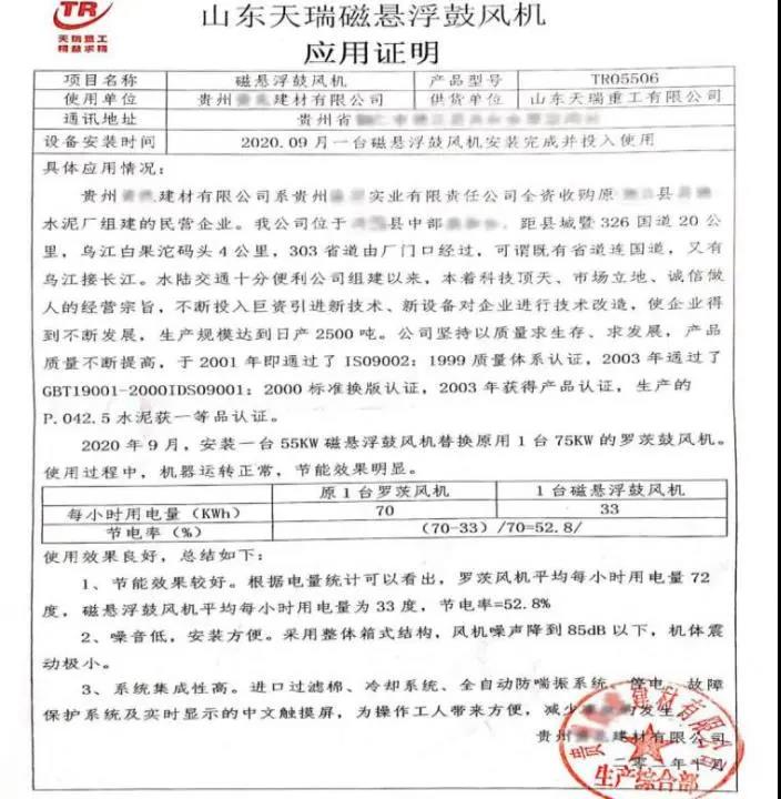 山東天瑞重工磁懸浮鼓風機在貴州某水泥廠應用為例(參見應用證明圖3),經天瑞重工技術人員現場精準勘測和技術論證后,用1臺55KW天瑞重工磁懸浮鼓風機替換原75KW羅茨風機,科學的安裝調試后,用電量由原羅茨風機用電量72KW/h,降低至現33KW/h,天瑞重工磁懸浮鼓風機節電率為52.8%(參見貴州某水泥現場安裝及應用證明圖3),節能效果顯著。