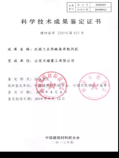 山東天瑞重工磁懸浮鼓風機在節能降噪方面一直是行業的標桿,2019年8月由中國建材聯合會和中國水泥協會組織召開“水泥工業用磁懸浮風機”科技成果評價會(鑒定證書參見圖4),評價結論為:天瑞重工磁懸浮項目的成功開發和應用,提升了我國水泥行業節能降噪水平,成果總體技術達到國際先進水平。
