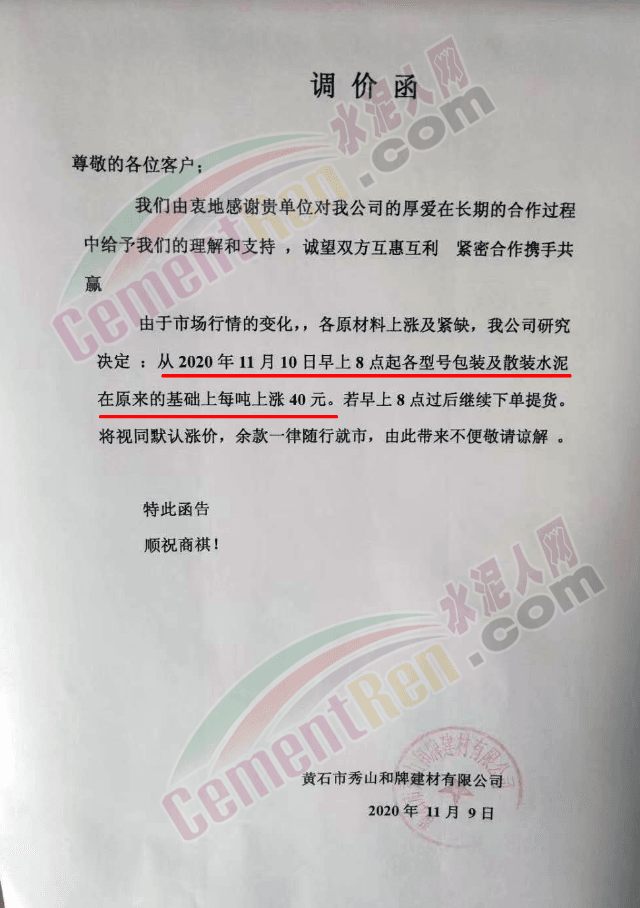 而區域主要品牌企業是在月初時通知上調水泥價格的。華新水泥湖北東區水泥事業部鄂州公司、黃石分公司、大冶公司通知,自11月5日起各品種等級散裝水泥在原價基礎上上調40元/噸。