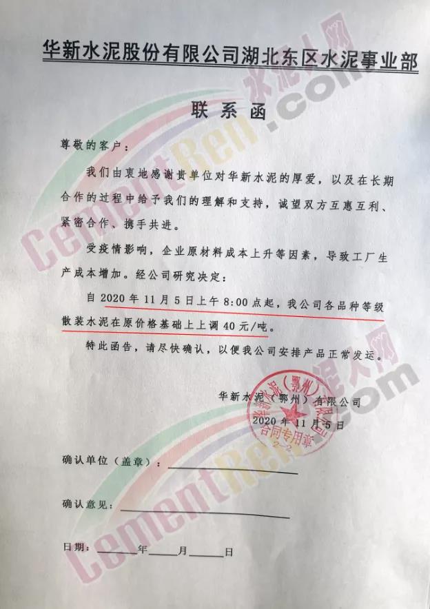 華新水泥(大冶)有限公司、華新水泥(陽新)有限公司、華新水泥(鄂州)有限公司通知受市場復工復產基本恢復的需求拉動,企業原材料成本上升等因素影響,導致工廠生產成本增加,經公司研究決定:自11月25日24時起,公司各品種等級散裝水泥在現行價格基礎上,上調30~40元/噸。
