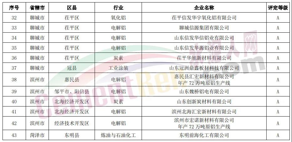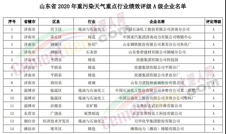 3、山東省2020年重污染天氣重點行業績效評級引領性企業名單
