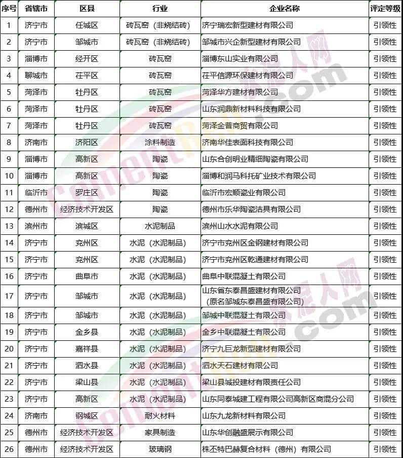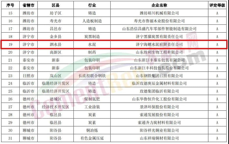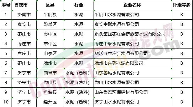 山東省發布水泥行業評級名單,1家A級,10家B級!