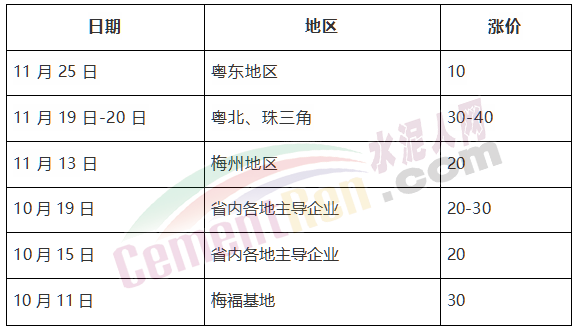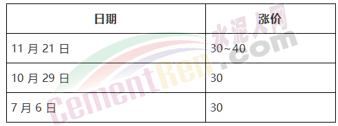 廣東省在11月份全區域普遍上調10~40元/噸,部分廠家對P.C42.5水泥價格上調50元/噸;10月普漲20~30元/噸,熟料上調10元/噸。下半年以來兩輪累計上調30~70元/噸。