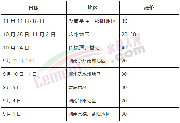 湖北地區武漢及鄂東地區分別在11月中上旬,11月下旬,10月中旬及9月中上旬、8月下旬分5次上調水泥價格,累計上調180元/噸。單位:元/噸
