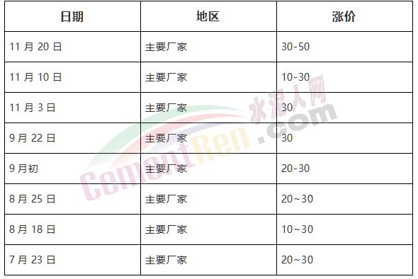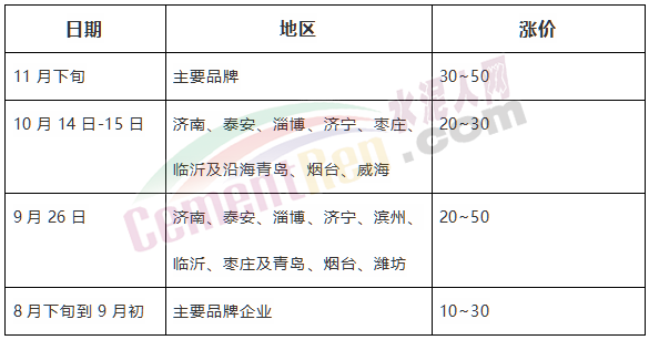 下半年以來安徽地區分別于8月份上旬、中旬、下旬;9月上旬、中下旬;以及11月上旬和中旬七次上調,累計上調達200~260元/噸。