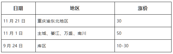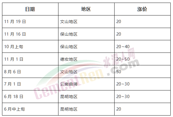 云南兩輪累計上調50~70元/噸云南省內各區域普遍上調兩輪,其中文山地區因淡季價格下滑嚴重,分別于8上旬和11月中下旬上調水泥價格累計上調50~70元/噸。其他區域普調40~50元/噸。