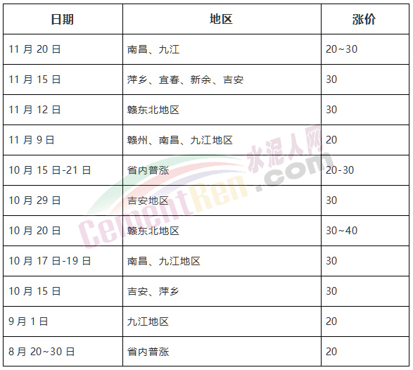 江西四輪連續上調120-130元/噸江西地區下半年以來從8月下旬開始調漲,分別在8月下旬至9月初、10月中正旬、11月初以及11月中下旬分四輪上調水泥價格,累計上調120~130元/噸。