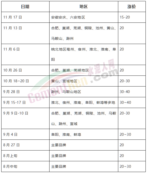 浙江省以上海周邊地區為主,下半年以來分別在7月下旬,8月上旬、下旬,9月中上旬以及10月中旬和11月中旬分六次上調水泥價格,累計上調135~170元/噸。